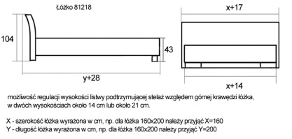 UWAGA: Za dopłatą możliwość zamówienia łóżka o nietypowej szerokości (od 120cm do 200cm) i długości (od 190cm do 220cm) w odstępach co 10 cm. Stelaż KF zalecany jest do materacy o wysokości wkładu nie większej niż 19 cm, a w przypadku wymiaru powyżej 160×200 cm, należy skontaktować się ze sprzedawcą w celu skonsultowania możliwości użytkowania wybranego materaca na tym stelażu. Możliwość zamówienia łóżka w wersji RM na ramie metalowej o nietypowej długości 190 i 210 cm.