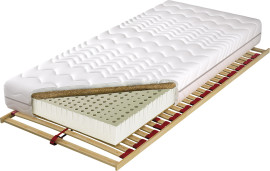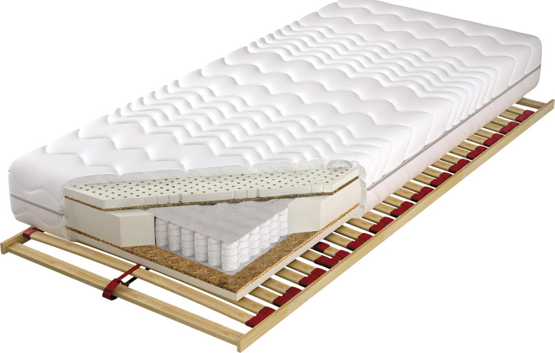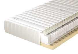 Wkład materaca ze sprężyn woreczkowych, z wysokogatunkowego drutu, obłożony jest z jednej strony przekładką tapicerską i 30 mm warstwą lateksu, a z drugiej strony 30 mm warstwą lateksu i 5 mm lateksowaną płytą kokosu.