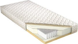 Wkład materaca zbudowany ze sprężyn woreczkowych, z wysokogatunkowego drutu, obłożony jest z jednej strony przekładką tapicerską, a z drugiej siatką tapicerską i 30 mm płytą lateksu.