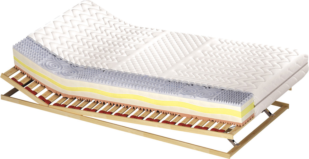 Wkład materaca jest pięciowarstwowy i składa się z: – modelowanej pianki masującej Standard Bio, – modelowanej pianki poliuretanowej T-25 o zwiększonej elastyczności , – specjalnie profilowanej pianki wysokoelastycznej H2, – modelo ...